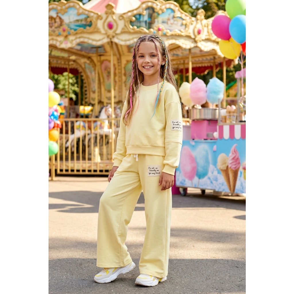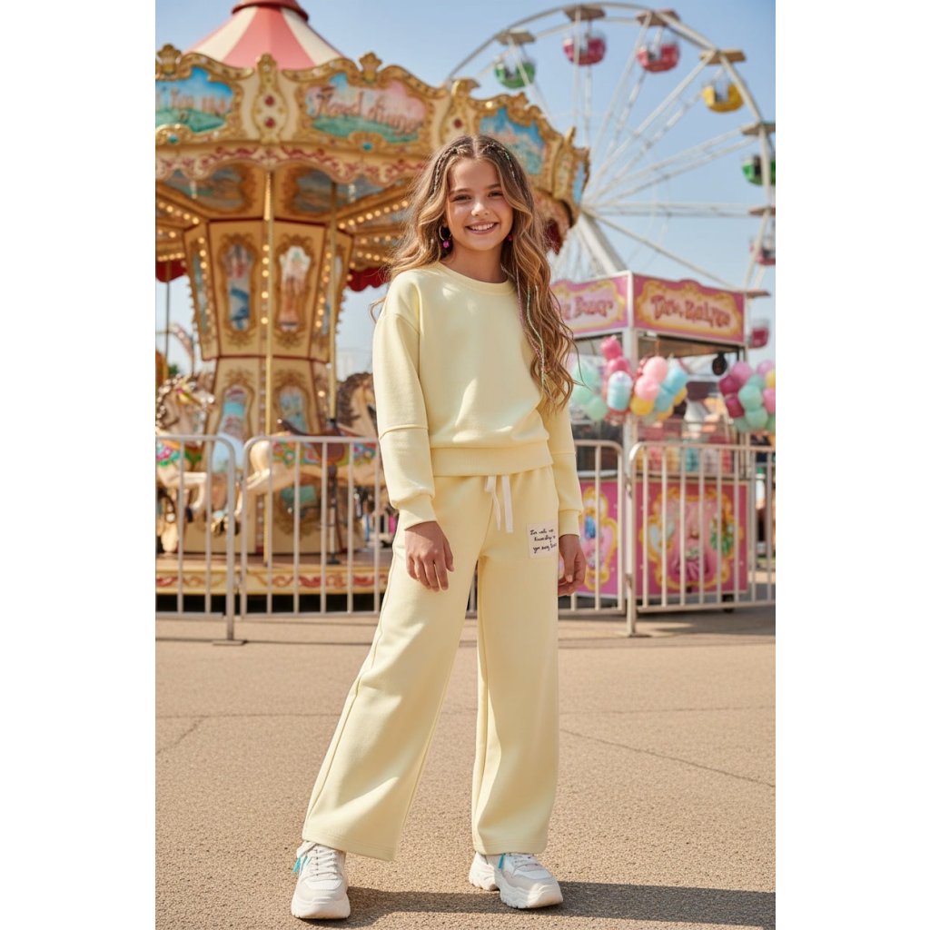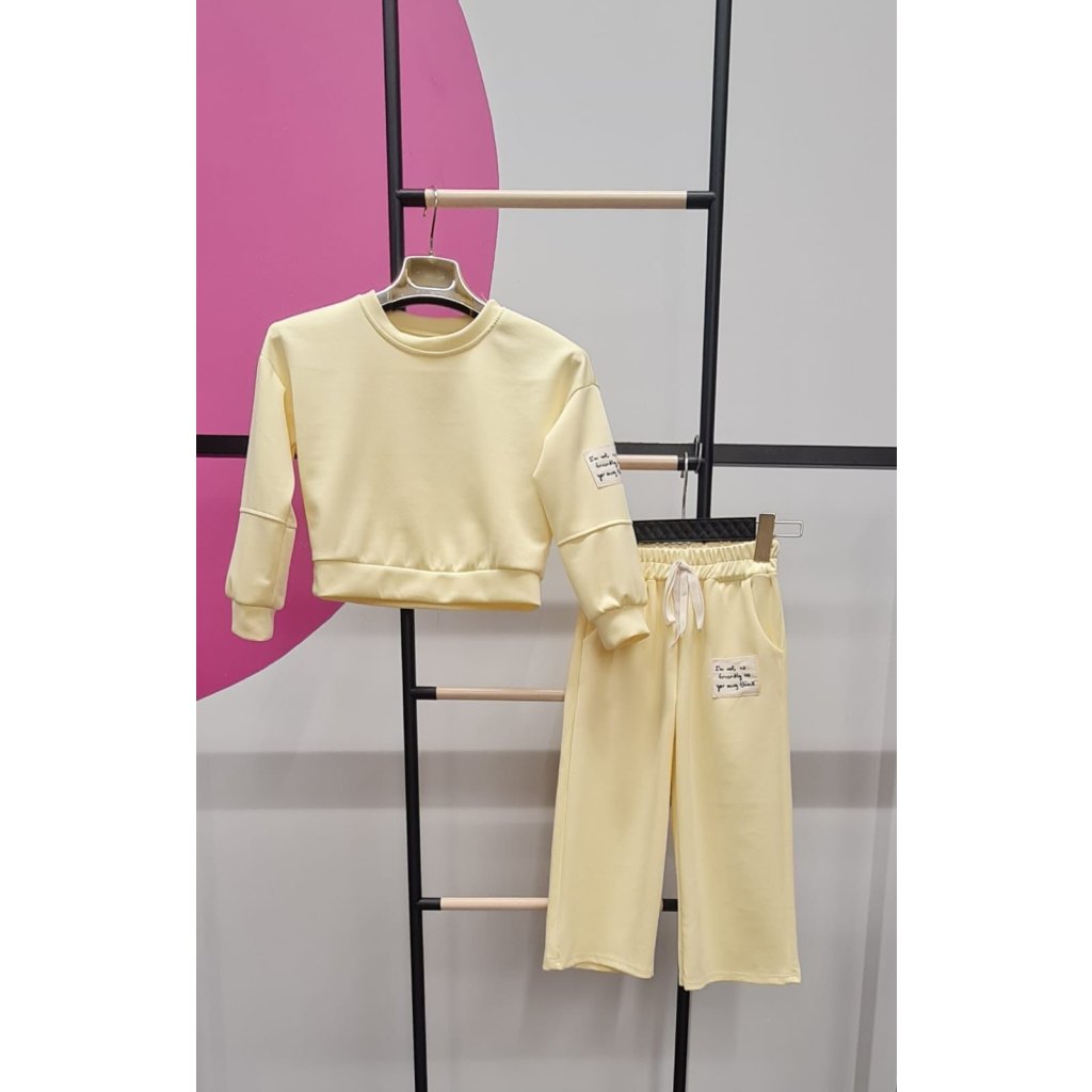 Lányoknak szóló pasztell színű melegítő szett stílusos és kényelmes viselet a mindennapi viseléshez. A szett tartalmaz egy rövid szabású, modern stílusú kapucnis pulóvert és széles melegítőt, amelyek maximális kényelmet és szabad mozgást biztosítanak. A pasztell színárnyalat finom és trendi megjelenést kölcsönöz a szettnek.