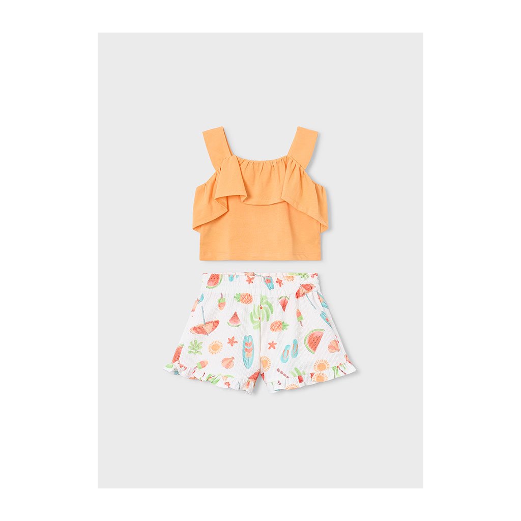 Nyári szett kombinálja egyszínű topot vállpántokkal és rövidnadrágot mintával. A rövidnadrágot kis fodor díszíti, ami játékos és lányos hangulatot kölcsönöz az öltözéknek. A szett könnyű és légáteresztő anyagból készült, ideális forró napokra, nyaralásra vagy szabadidős tevékenységekre.
