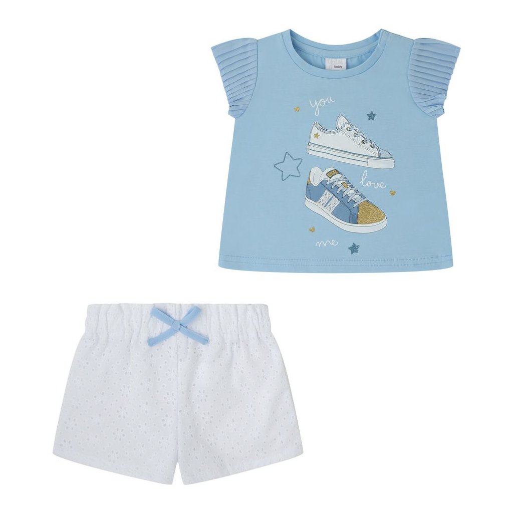 Elegáns és kényelmes nyári szett kicsi lányoknak, amely ötvözi az eleganciát, a stílust és a kényelmet. Ez a két részes szett kék pólót tartalmaz bájos fodrokkal és fehér rövidnadrágot csipkézett díszítéssel, amelyek finom és játékos jelleget kölcsönöznek az öltözéknek.
