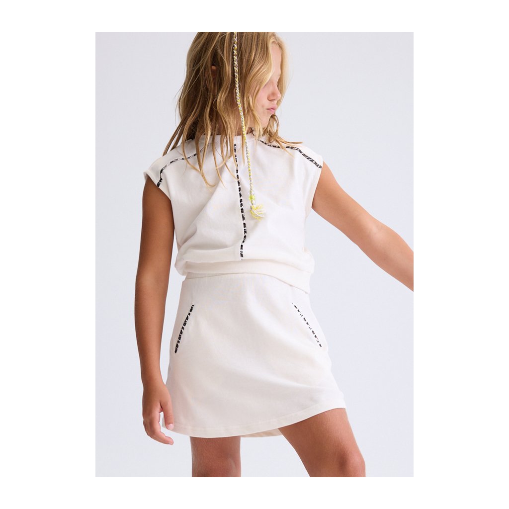 Stílusos lány szett, amely világos szoknyából és szabadon álló felsőből áll, elefántcsont színben, ideális mindennapi viseletre. Finom leo szegély ad egy játékos és elegáns részletet a szettnek, amely finoman kiemeli az összképet.