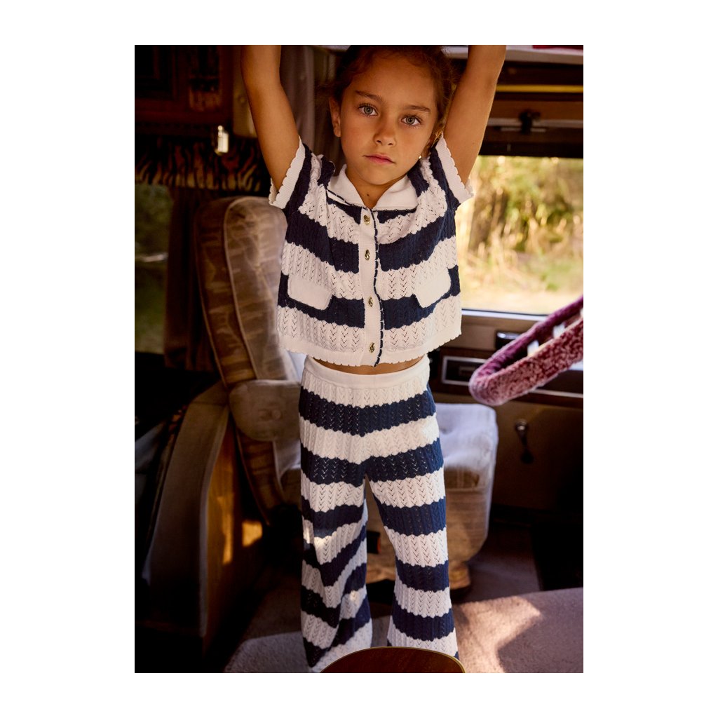Lányka nyári szett retro stílusban elbűvöl finom horgolt megjelenéssel és időtlen csíkos mintázattal fehér-kék kombinációban. A felső gombos záródással elegáns és játékos hatást kelt, míg a bővített nadrág könnyedséget és stílusos retro hangulatot kölcsönöz az öltözéknek. A kellemes, légies anyag ideális a meleg nyári napokra, legyen szó sétákról, nyaralásról vagy családi ünnepekről.