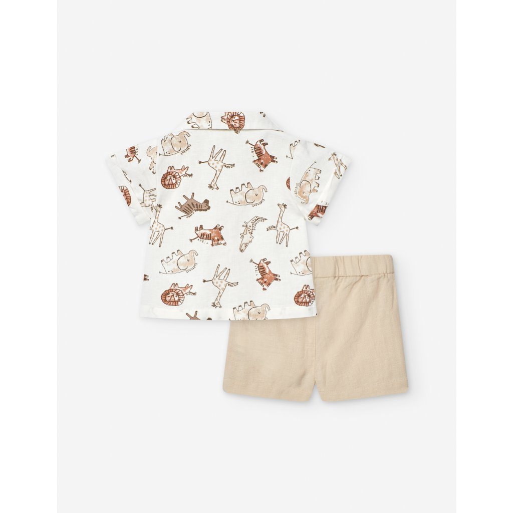 Cuki 2 részes fiú szett a legkisebbeknek, amely ötvözi a kényelmet és a stílust, tartalmaz egy könnyű nyomott inget mindkét oldalon, ami játékos és modern megjelenést kölcsönöz az öltözéknek. Része a kényelmes gumis derekú rövidnadrág is, amely könnyen fel- és levethető, és egész nap jól illeszkedik. Az anyag légáteresztő, puha és ideális kényelmet biztosít az érzékeny gyermekbőr számára.