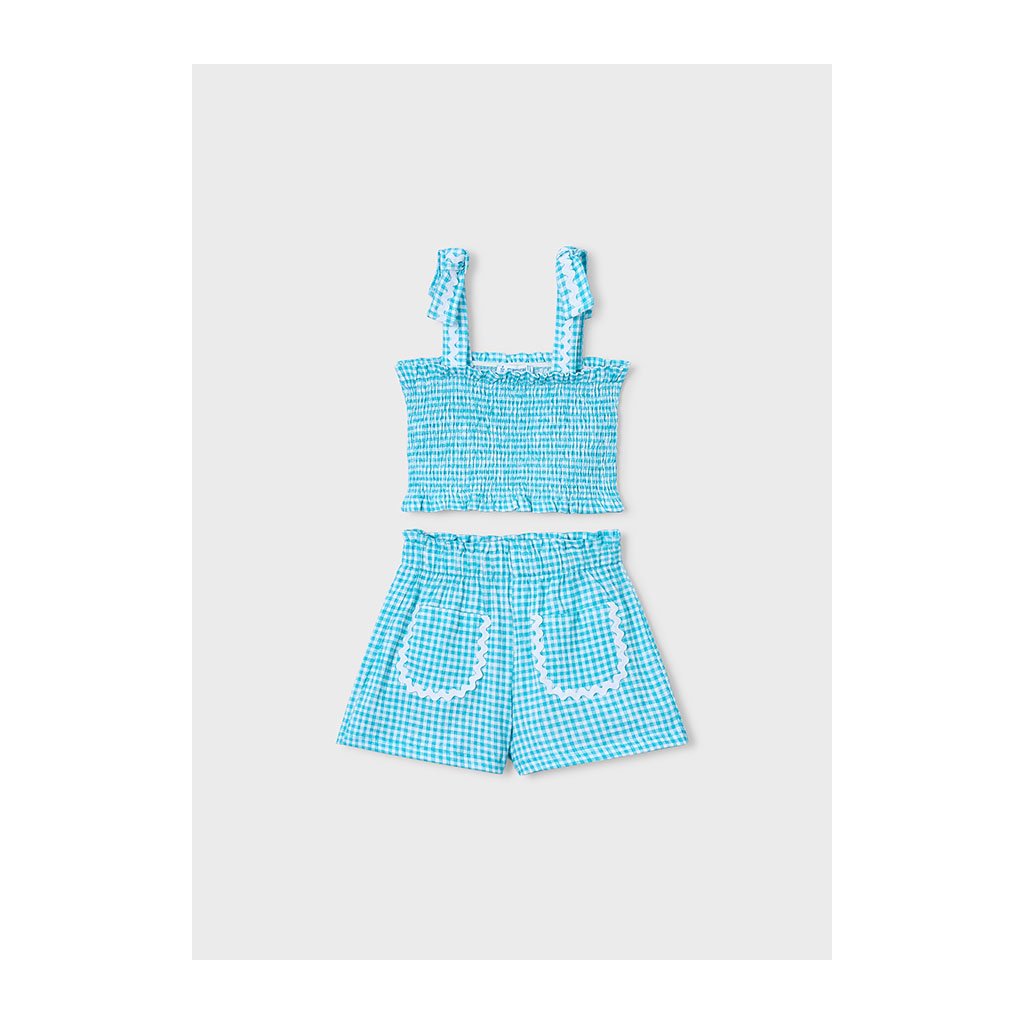 A lányok nyári szettje ötvözi a kockás mintát finom hímzett hullámokkal és játékos részletekkel. A felső részen behúzott gumival van, ami jobb tartást és kényelmet biztosít viselés közben. A vállpántokat masnik díszítik. A szett könnyű és légáteresztő anyagból készült, ideális forró napokra, nyaralásra vagy szabadtéri játékokra.