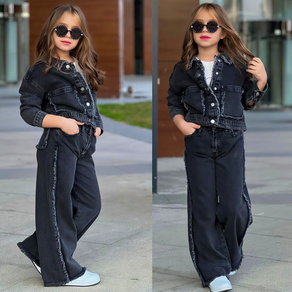 Stílusos farmer szett lányoknak eredeti részletekkel. A zseb körüli részt szakadt farmer hatás díszíti, ami modern és trendi megjelenést kölcsönöz az öltözéknek. Díszítő elemek hangsúlyozzák a dizájnt, és különlegessé teszik a szettet.