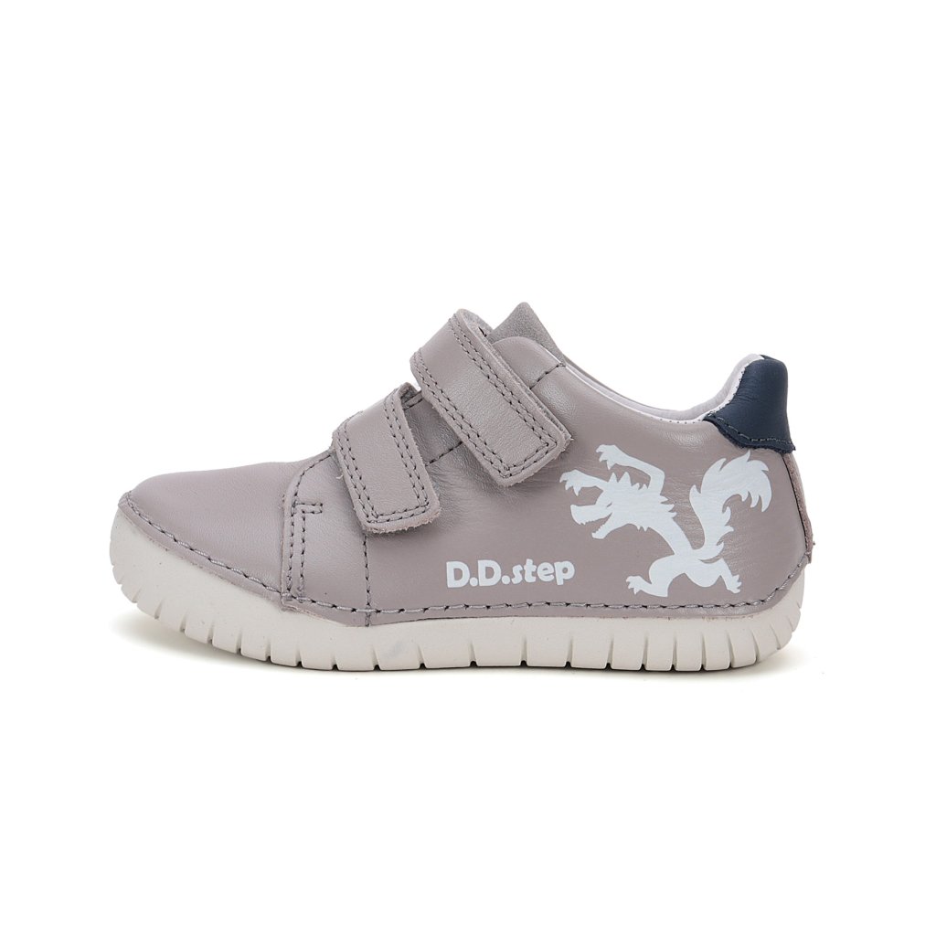 Bőr gyermekcipő, átmeneti cipő D.D.STEP márkától, ortopéd talpbetéttel és formázott boltozattal. A cipő ideális a legkisebbek számára, akik tanulnak járni, mivel puha, könnyű és nagyon hajlékony. Átmeneti időszakra alkalmas. A záródás tépőzárral történik. Elöl magasított gumi védi a kopástól.