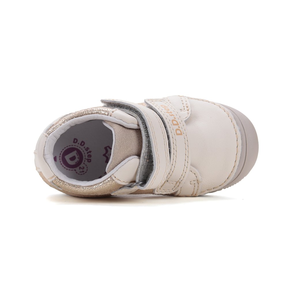 Minden D.D. Step cipő valódi, kiváló minőségű marhabőrből készül, hogy tökéletesen alkalmazkodjon a gyerek lábához. Az orr-rész úgy van kialakítva, hogy védje a lábujjakat, támogassa azok helyes növekedését, és növelje a cipő tartósságát.