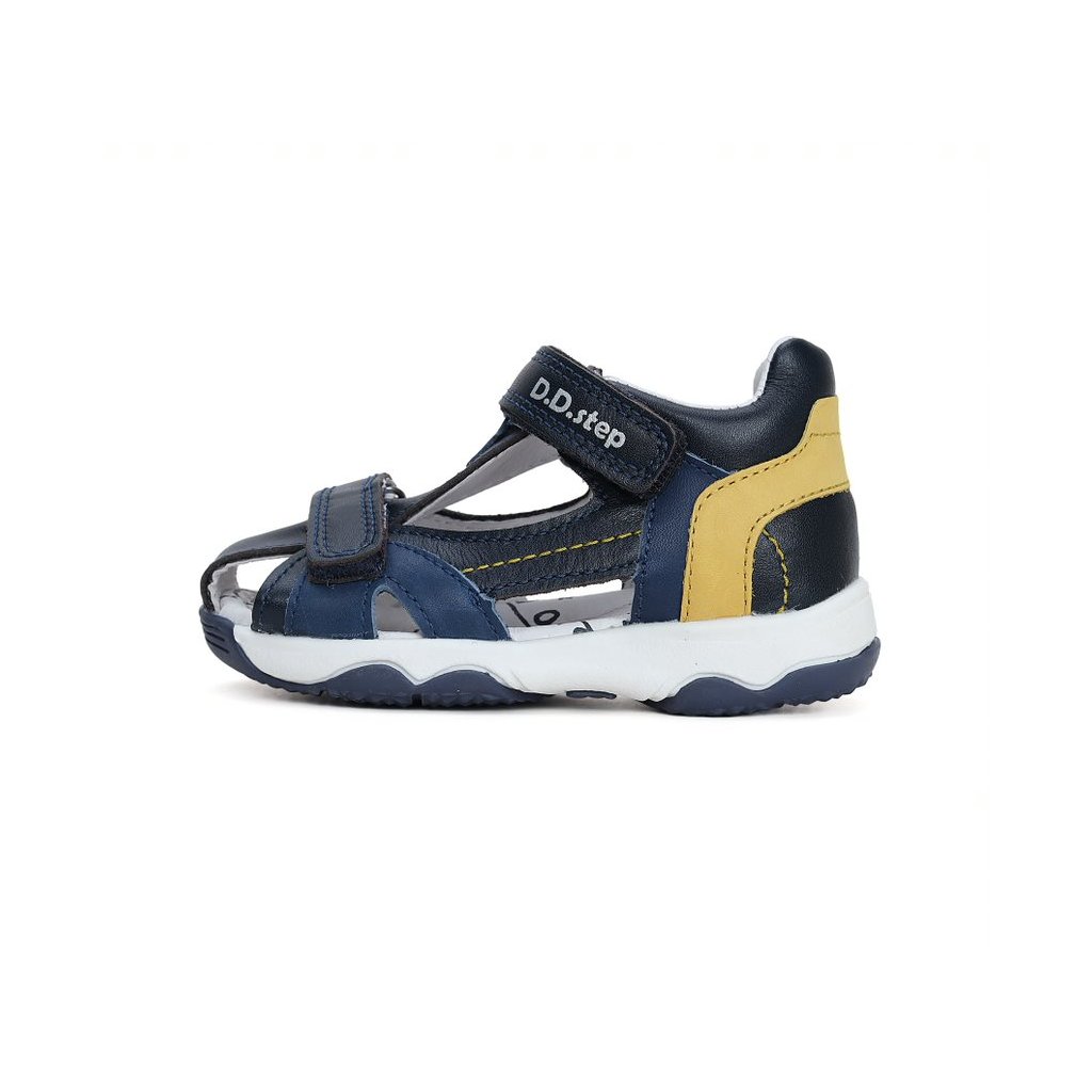 Masszív bőr ortopéd szandál DD Step zárt sarokkal és orral kiváló támogatást és védelmet nyújt a gyermek lábának mindennapi viselet során. Ideális azoknak a gyerekeknek, akik stabil lábbelit keresnek, a kényelem és a helyes lábtartás hangsúlyozásával.