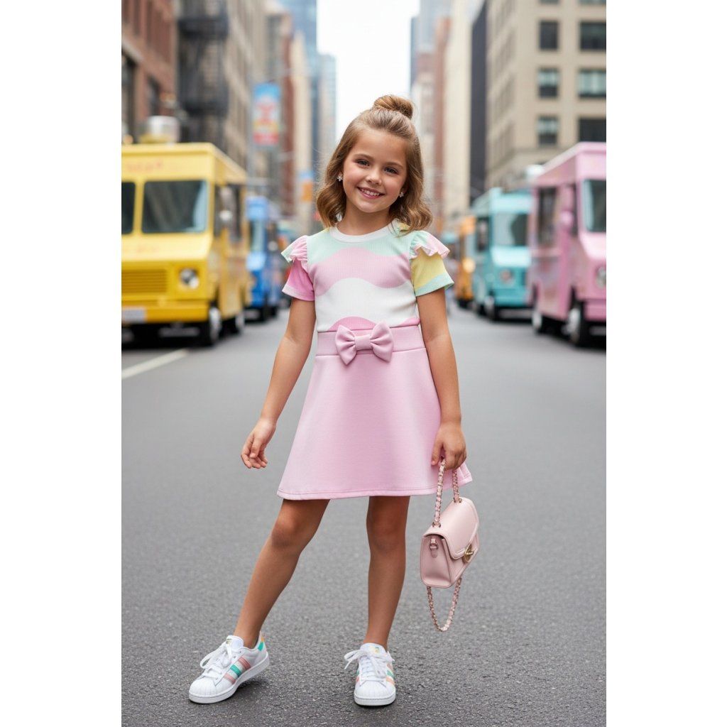 Dievčenské šaty v pastelových tónoch s jemným vlnovým vzorom sú ideálne na každodenné nosenie aj menšie slávnostné príležitosti. Horná časť šiat je zdobená decentným vlnovým vzorom a volánikmi, zatiaľ čo jednofarebná sukňová časť je doplnená elegantnou mašľou v páse, čo dodáva outfitu hravý aj nežný vzhľad. Šaty sú vyrobené z ľahkého a pohodlného materiálu, ktorý zabezpečuje komfort počas celého dňa.