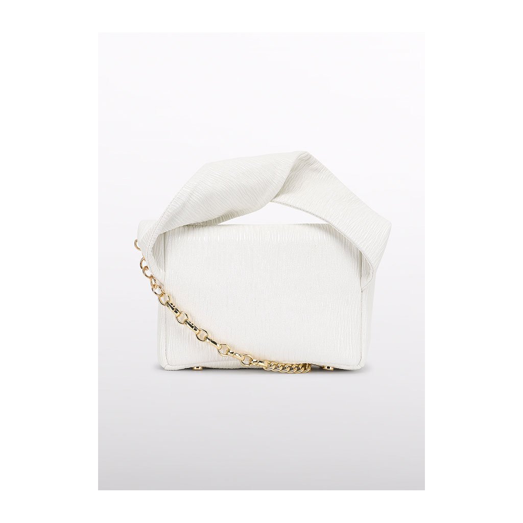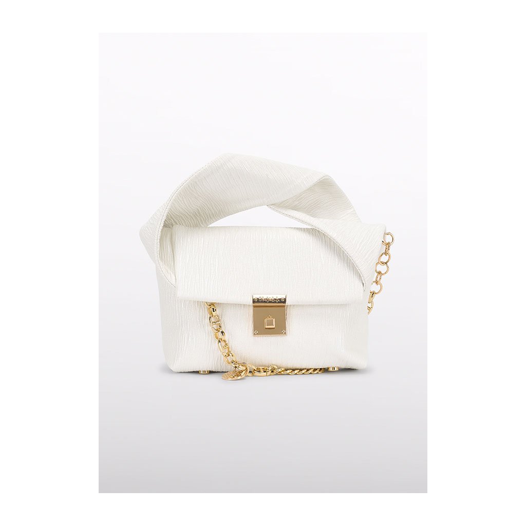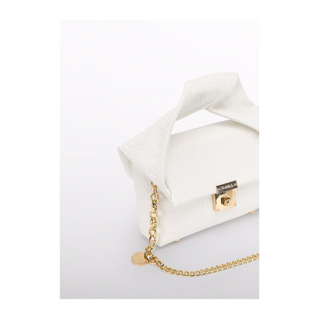Luxus női táska az Abel & Lula márkától elegáns fehér színben kiemelkedik vastag csavart fogantyúval és arany lánccal a vállra, amely egyedülálló stílust és praktikusságot kölcsönöz a táskának. Az arany részletek és az eredeti dizájn hangsúlyozzák exkluzív jellegét, ideális különleges alkalmakra, ünnepekre vagy ünnepi öltözékekhez.