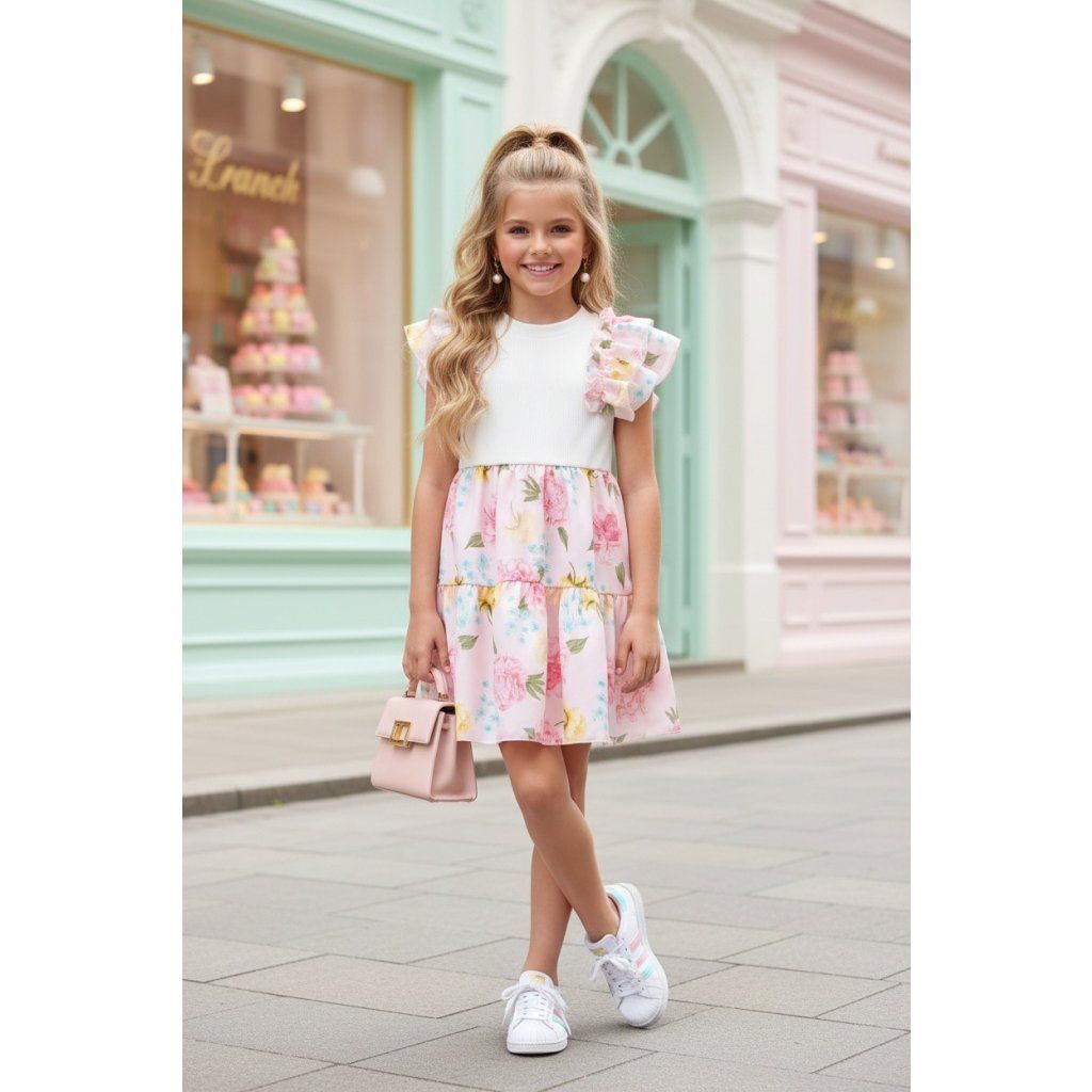 A bordás míderrel és virágos szoknyával ellátott lányruha tökéletes választás a mindennapokra és különleges alkalmakra. A puha felsőrész bőrbarát és szépen tartja az alakját, míg a könnyű, finom virágmintás szoknya játékos, kislányos megjelenést kölcsönöz a ruhának. Az ugyanilyen mintájú fodros ujjak tökéletesen összehangolt egészet alkotnak.