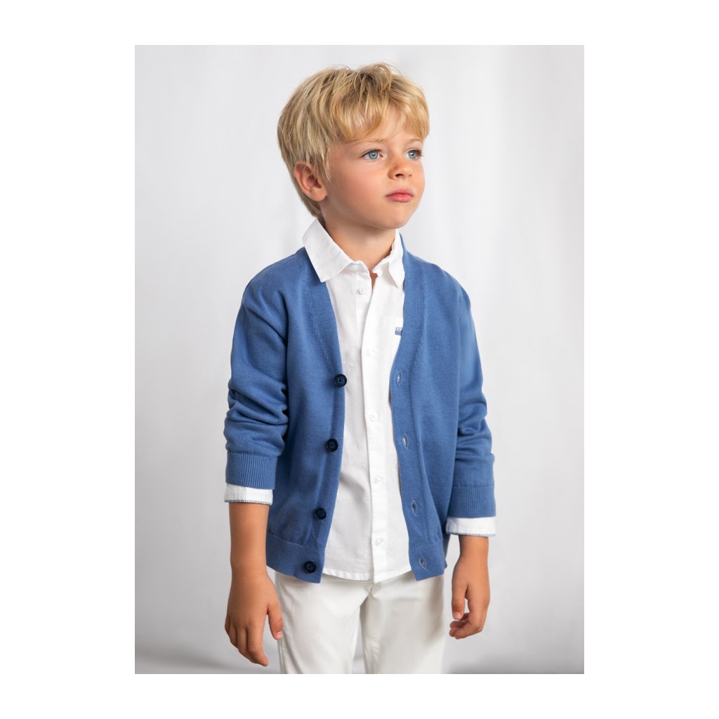 Az elegáns kötött pulóver fiúk számára V-nyakkal stílusos választás mindennapi viselethez, valamint ünnepélyesebb alkalmakra is. A pulóver gombokkal záródik, ami megkönnyíti a fel- és levételt, valamint állítható viseletet tesz lehetővé. A minőségi kötött anyag kényelmet és meleget biztosít a hűvösebb napokon.