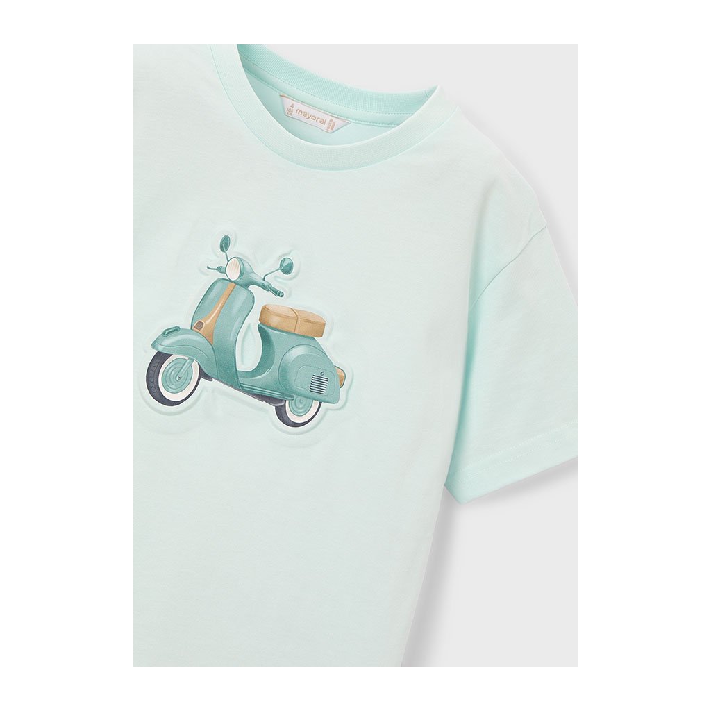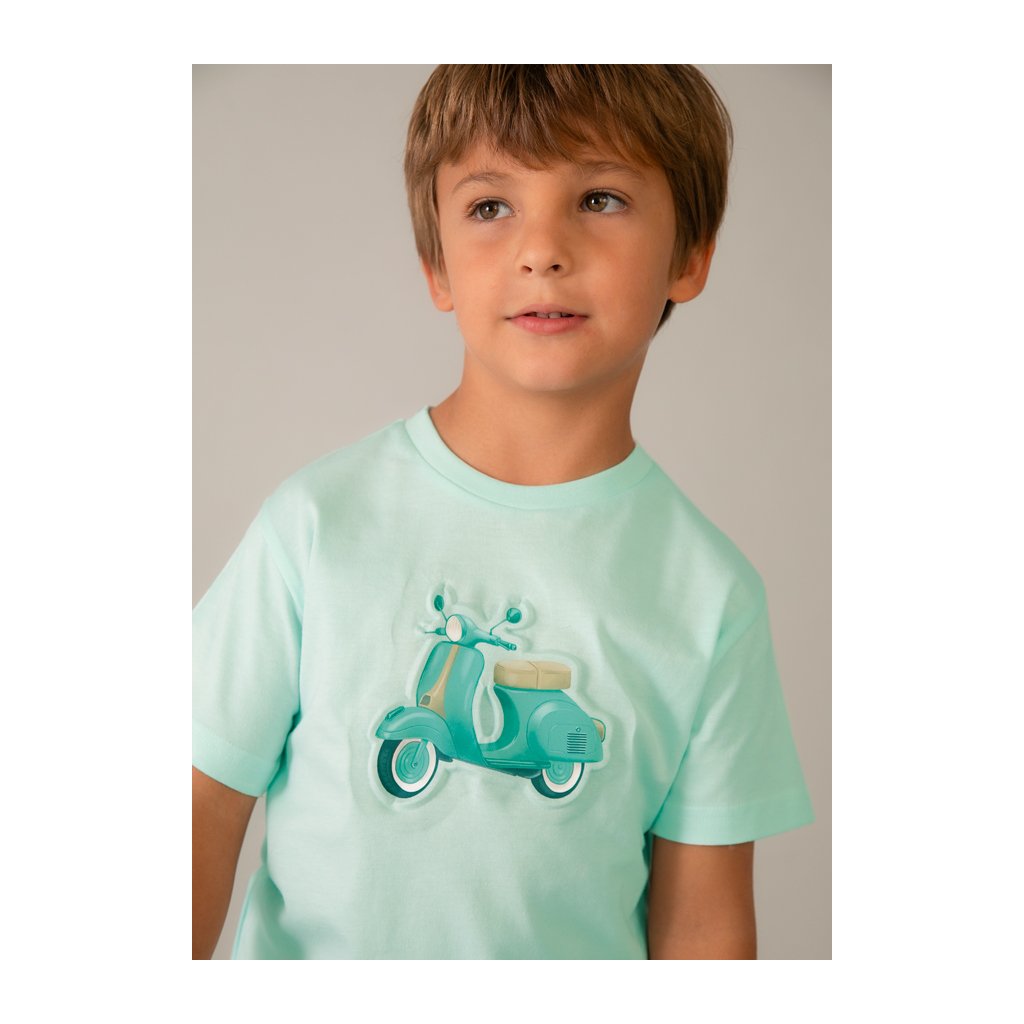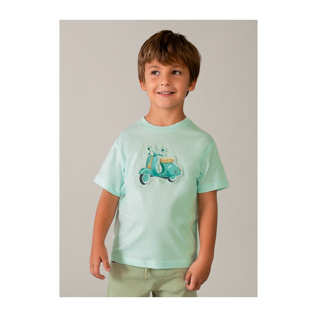 100% pamut fiús póló a márkától Mayoral mindennapi viseletre. Az elülső oldalon kedvelt motorkerékpár nyomtatás található, amely minden kis kalandor figyelmét felkelti. A póló klasszikus szabású, kerek nyakkal és rövid ujjakkal, így könnyen kombinálható nadrággal vagy rövidnadrággal.