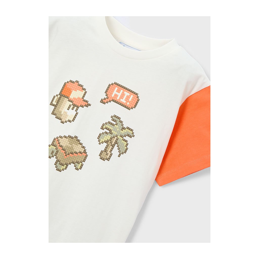 Belegáns fiús póló a márkától Mayoral modern és játékos dizájnt kínál pixel stílusú grafikai nyomtatással, amely emlékeztet a népszerű játékra, a Minecraft-ra. Ez ideális kisebb és nagyobb digitális kalandrajongóknak egyaránt. A Mayoral európai gyermekdivatmárka, amely ismert minőségéről, eredeti nyomtatásairól és kényelmes szabásáról.