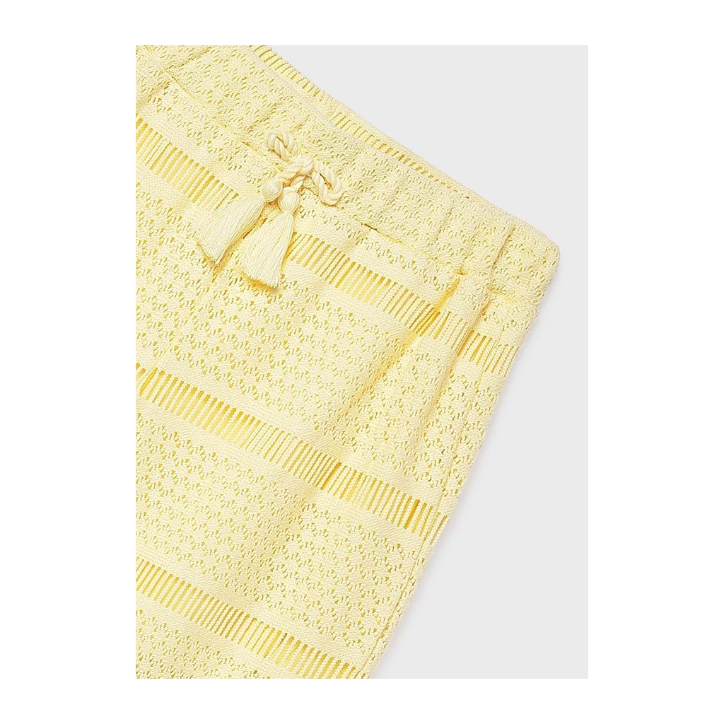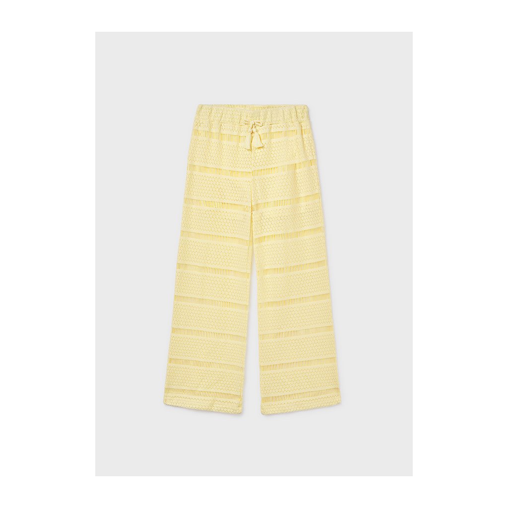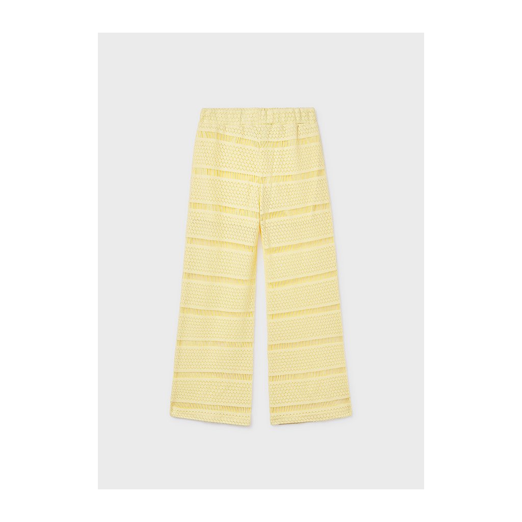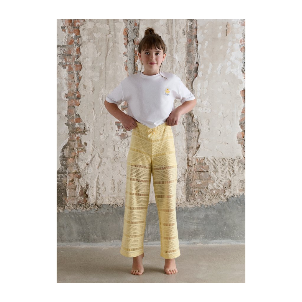 Stílusos retro lány nadrág sárga színben, áttetsző csíkokkal, ideális nyárra és mindennapi viseletre. Széles és légáteresztő szabás biztosítja a kényelmet és a szabad mozgást, míg az áttetsző csíkok modern és játékos megjelenést kölcsönöznek a nadrágnak.