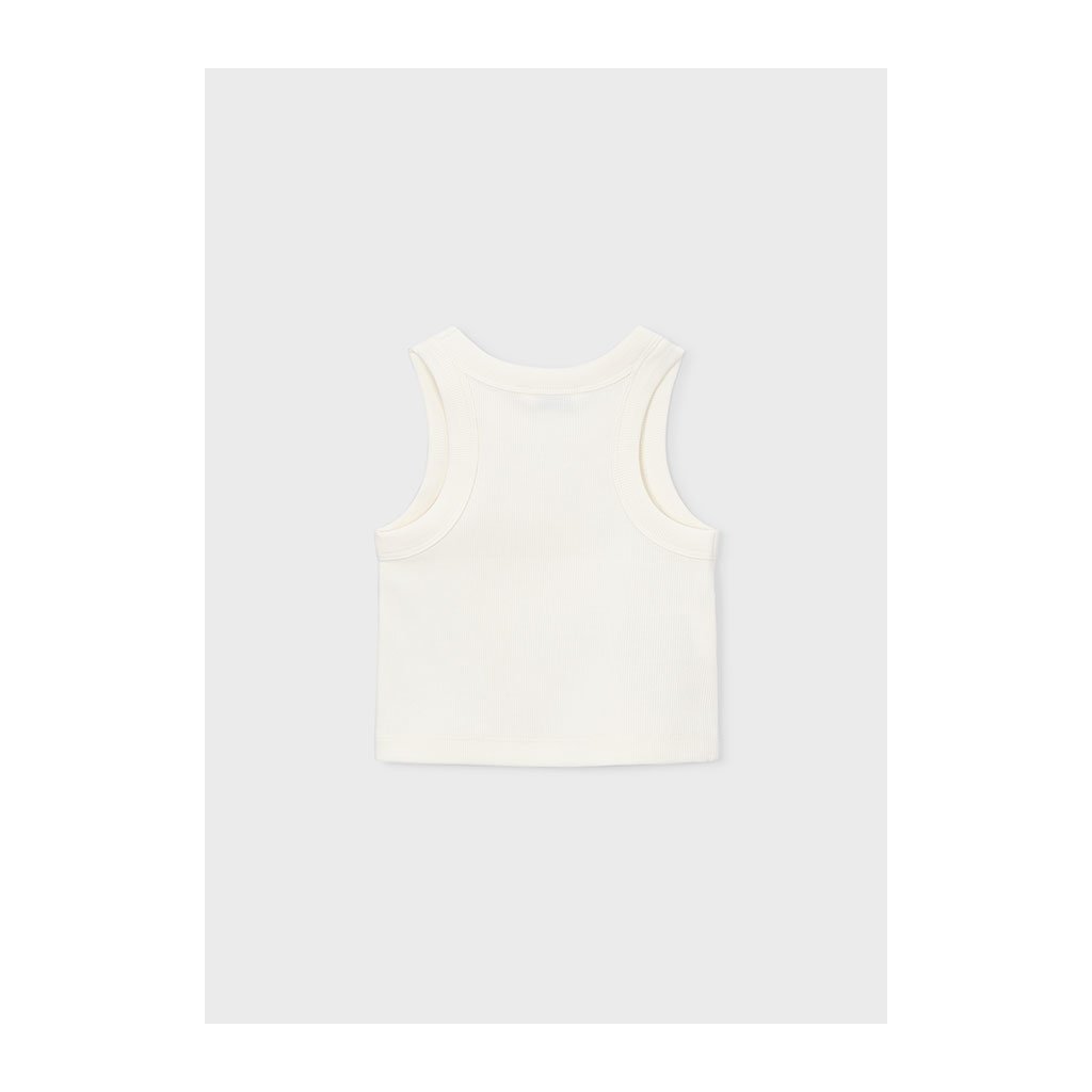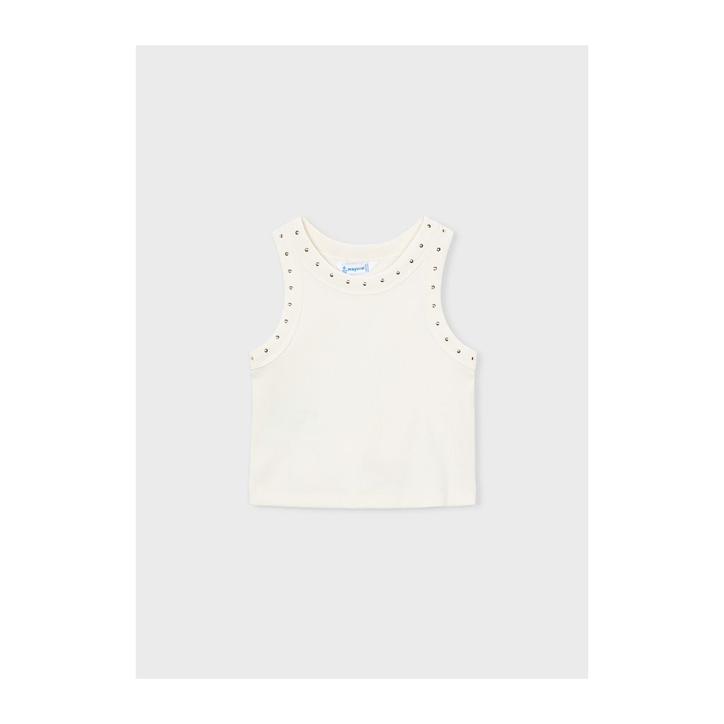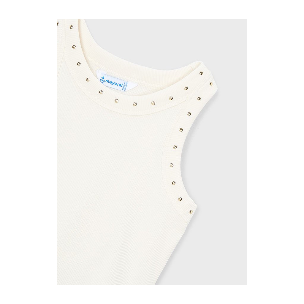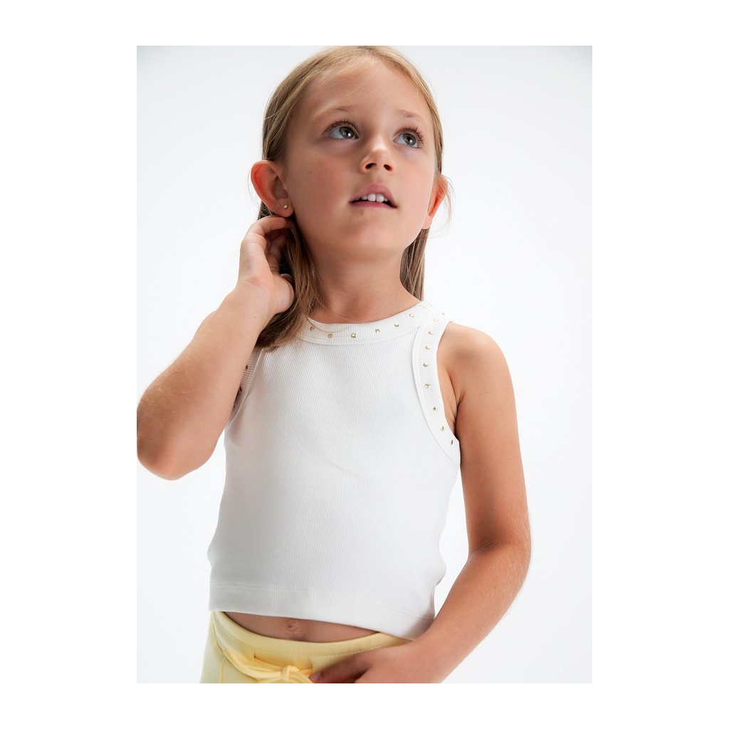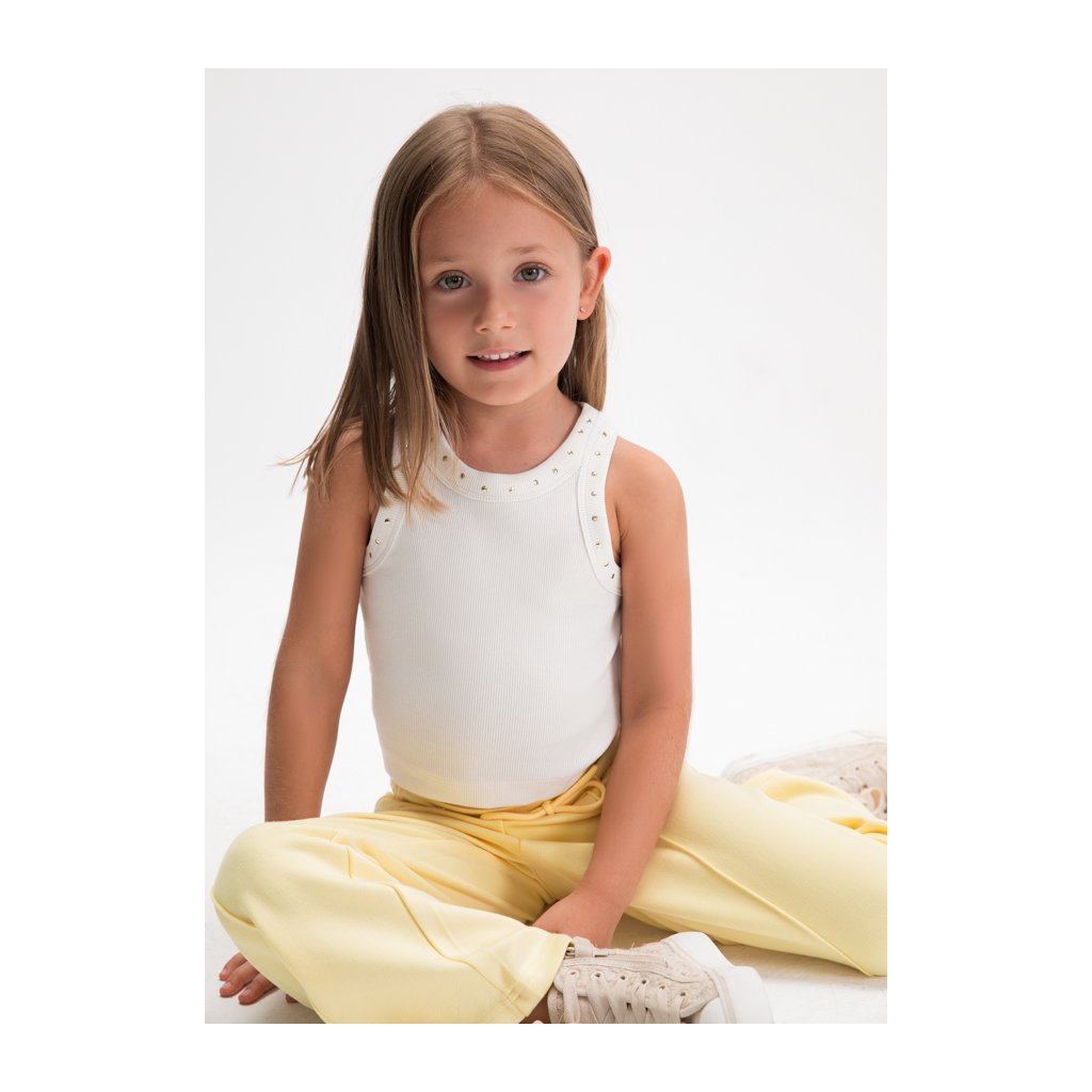 A lányoknak készült bordázott top a Mayoral márkától. A nyak körül finom kis cérnákkal díszítették, amelyek trendi és stílusos megjelenést kölcsönöznek a topnak. Egyszerű szabás lehetővé teszi könnyű kombinálását rövidnadrággal, szoknyával vagy leggingszel.