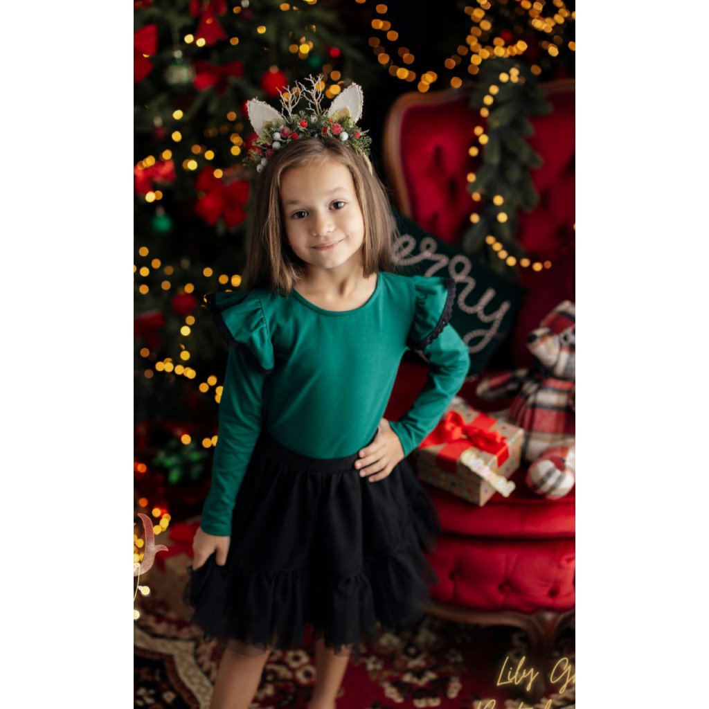 Aranyos lányka póló zöld színben, finom fodrokkal díszítve, amelyek játékos és lányos megjelenést kölcsönöznek. Kényelmes és kellemes viselet, ideális mindennapokra – iskola, óvoda vagy szabadidő.