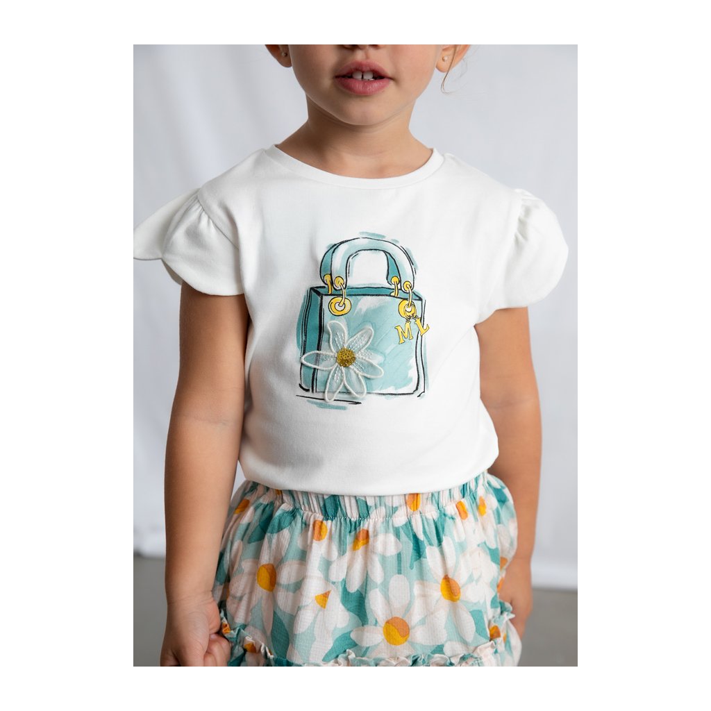 Lányka Mayoral puha, jó minőségű pamutból készült rövid ujjú póló. Az elülső oldalon gyönyörű díszítő applikáció található, amely feldobja és játékossá teszi a pólót. A póló klasszikus szabású, kerek nyakkivágással, könnyen kombinálható nadrággal, szoknyával vagy leggingszel. Ideális önálló darabként vagy rétegezett outfit részeként minden évszakban