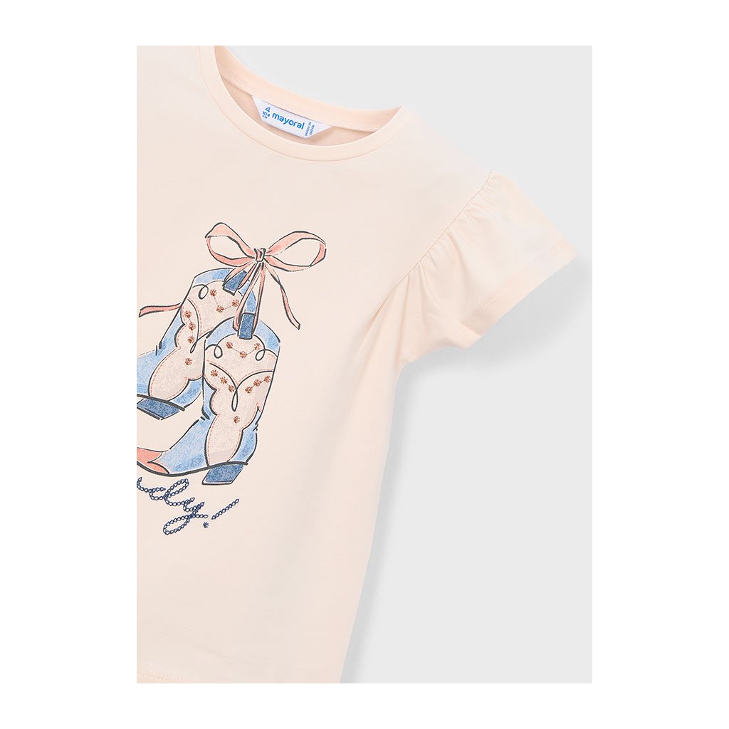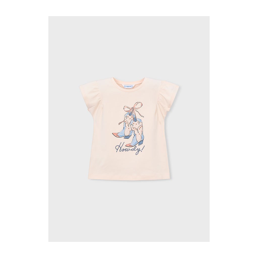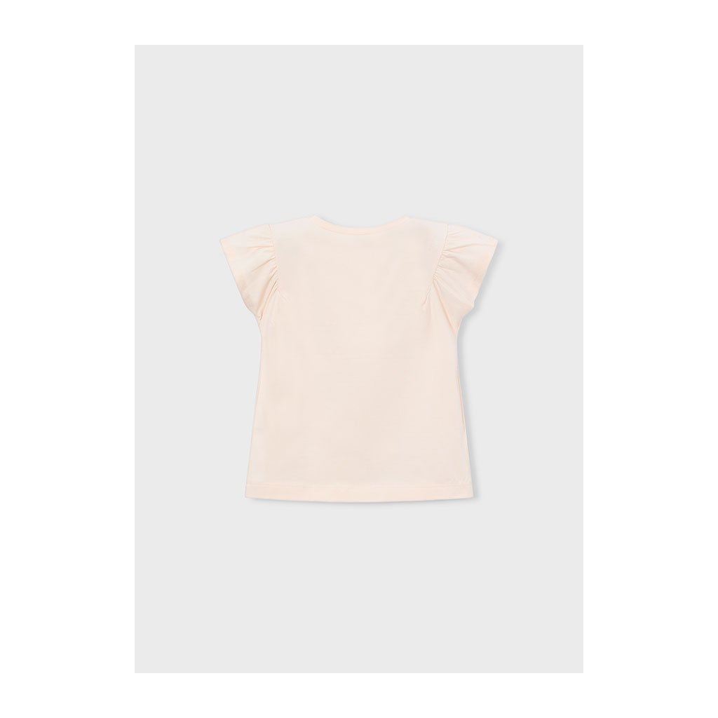 A lányka póló a Mayoral márkától kellemes pamutból készült, amely egész nap kényelmet biztosít. Van laza szabású rövid ujjú, finom fodros stílusban, ami lányos és elegáns hatást kelt. Az elülső részt egy szép alkalmazás díszíti, ami egyedi megjelenést kölcsönöz a pólónak. Nagyon jól párosítható nadrággal, szoknyával vagy leggingszel, és ideális mindennapi viseletre.