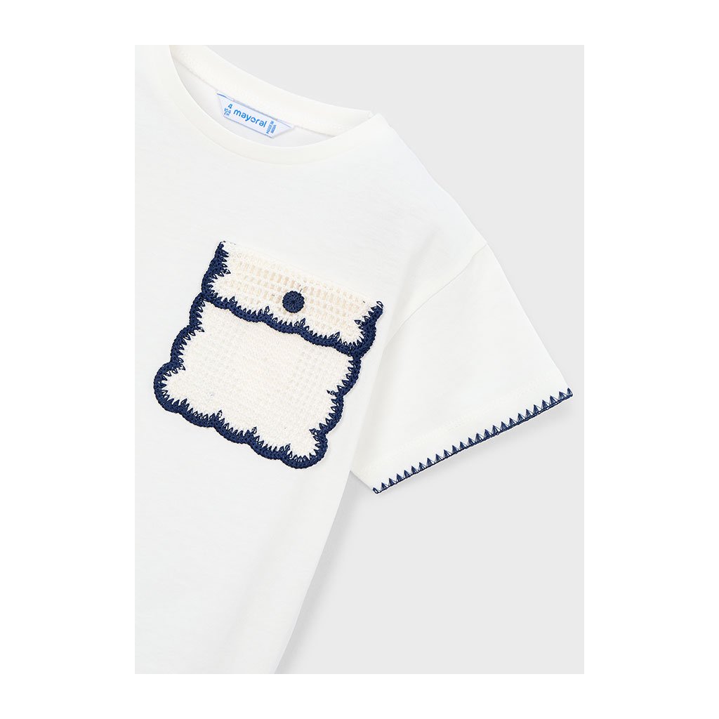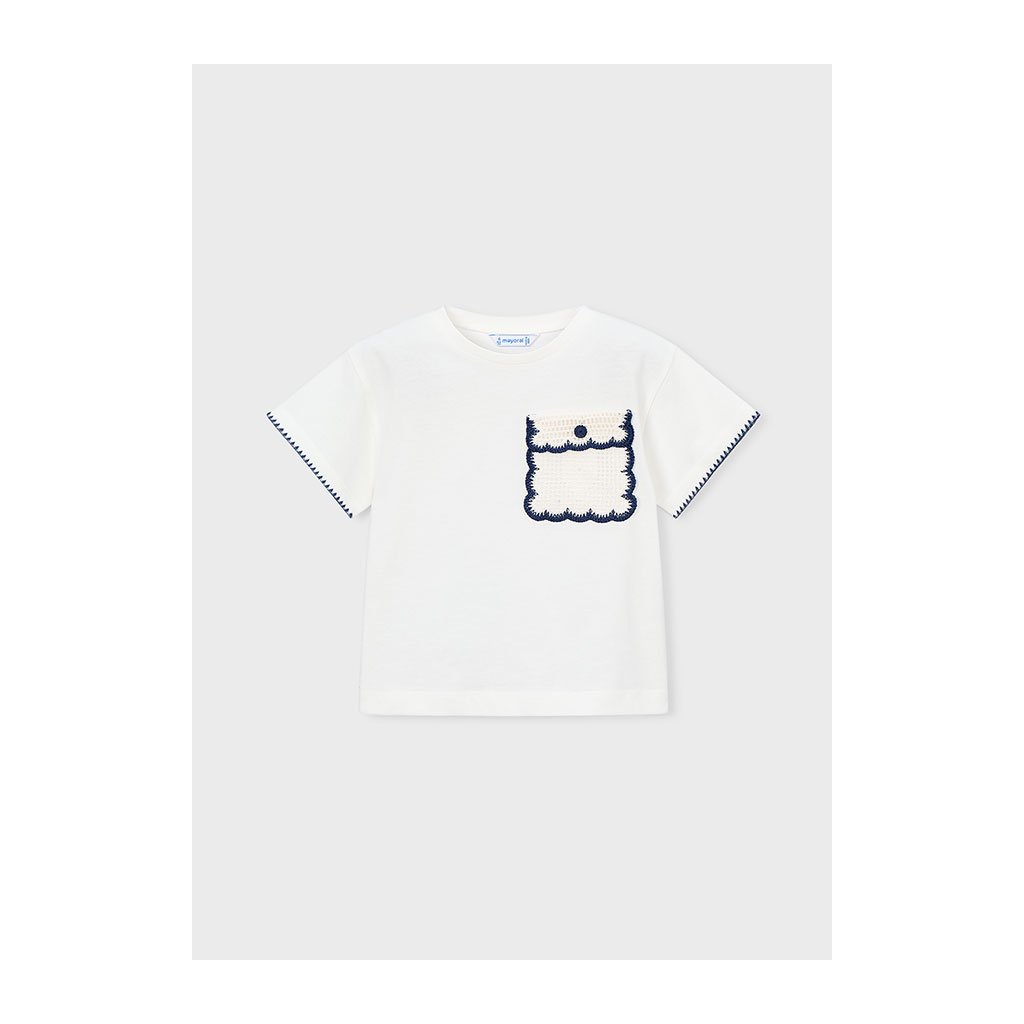 Az Mayoral márkájú lányka pamut póló ideális minden napra. Az elülső részt egy kis zseb díszíti finom horgolt mintával, amely eredeti és lányos megjelenést kölcsönöz a pólónak. Finom horgolás található a karokon is, így elegáns és stílusos megjelenést kölcsönöz a pólónak. Egyszerűen párosítható nadrággal, szoknyával vagy leggingszel.