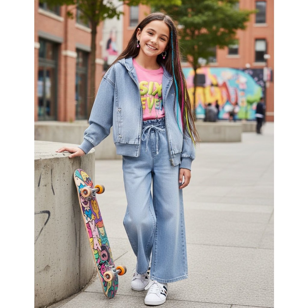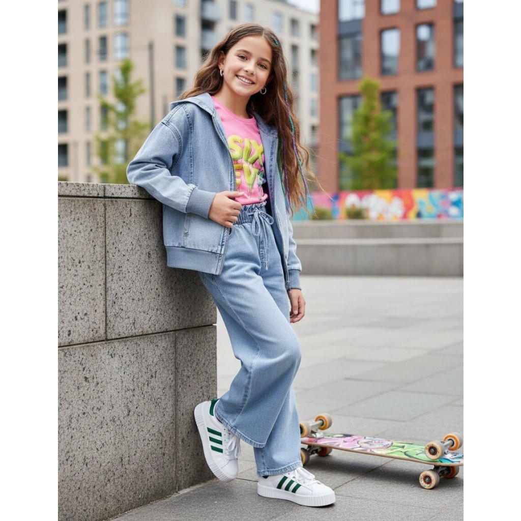 Lányos kapucnis farmerdzseki kényelmes és stílusos darab mindennapi ruhatárhoz. A laza szabás kényelmet nyújt és modern, lezser megjelenést kölcsönöz. A praktikus elülső zsebek ideálisak apróságoknak vagy kézmelegítésre. A minőségi farmer anyag tartós és kellemes viselet. A kapucni feldobja a dzseki megjelenését. Ideális iskola, szabadidő vagy séták során.