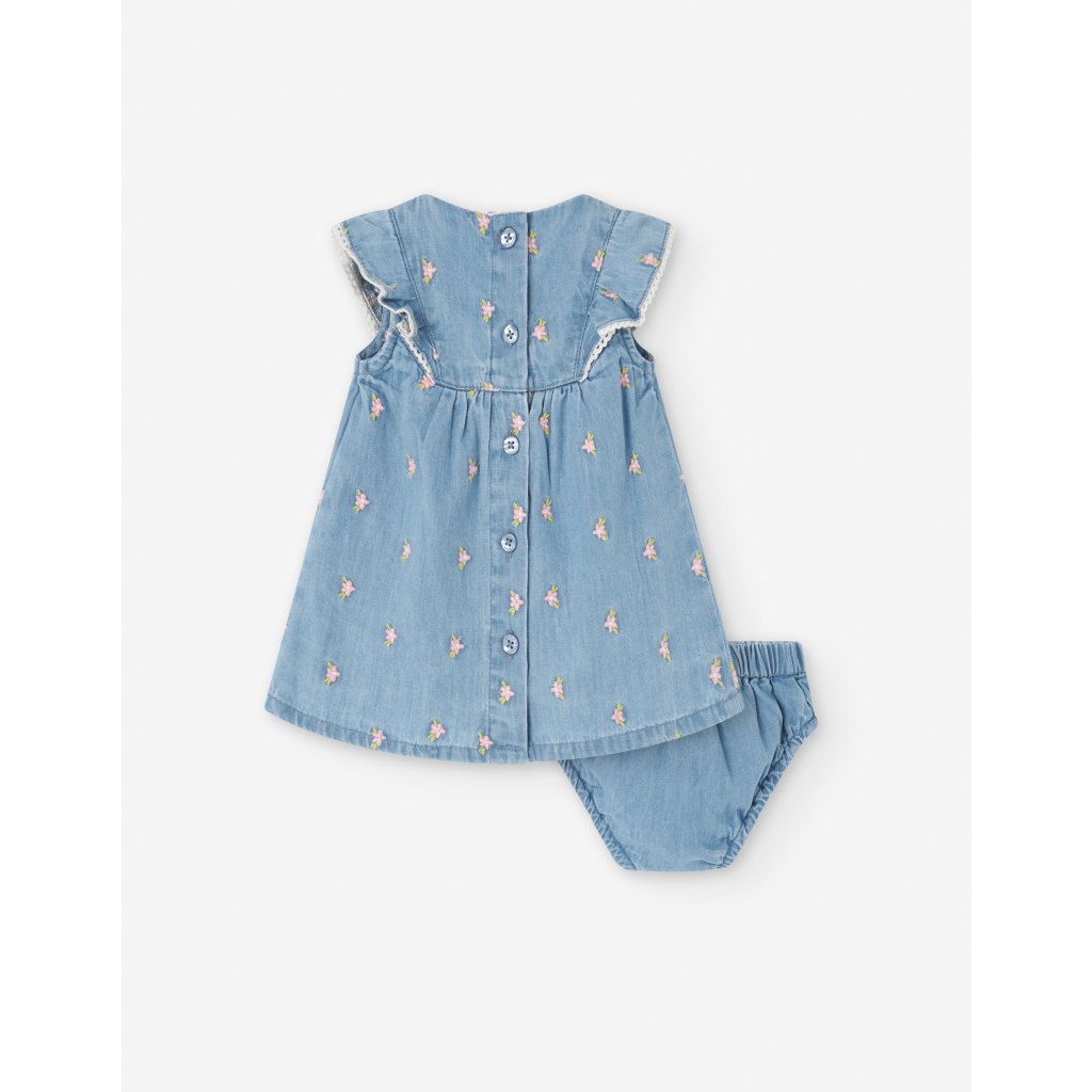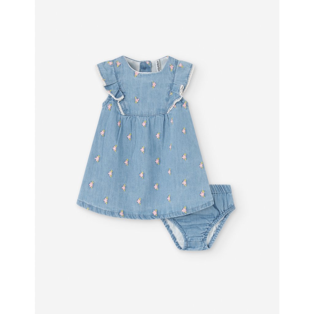 Stílusos és kényelmes szett kicsi hölgyeknek. A tunika szabású farmerruha finom fodrokkal van díszítve, amelyek lányos és modern megjelenést kölcsönöznek az öltözéknek. A szett része a praktikus alsónadrág, amely biztosítja a kényelmet és a szabad mozgást egész nap.
