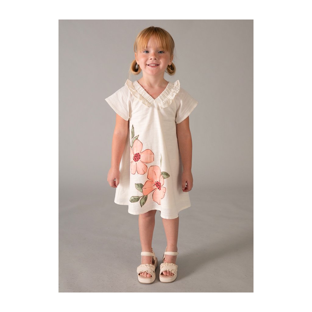 Pamut ruha V-nyakkivágással, kényelmes és stílusos választás meleg napokra. Kellemes és légáteresztő anyaga biztosítja a kényelmet egész nap. A nagy virágos nyomat az oldalán hangsúlyos és modern megjelenést kölcsönöz a ruhának. A ruha alkalmas mindennapi viseletre, mind nyári szórakozásra.