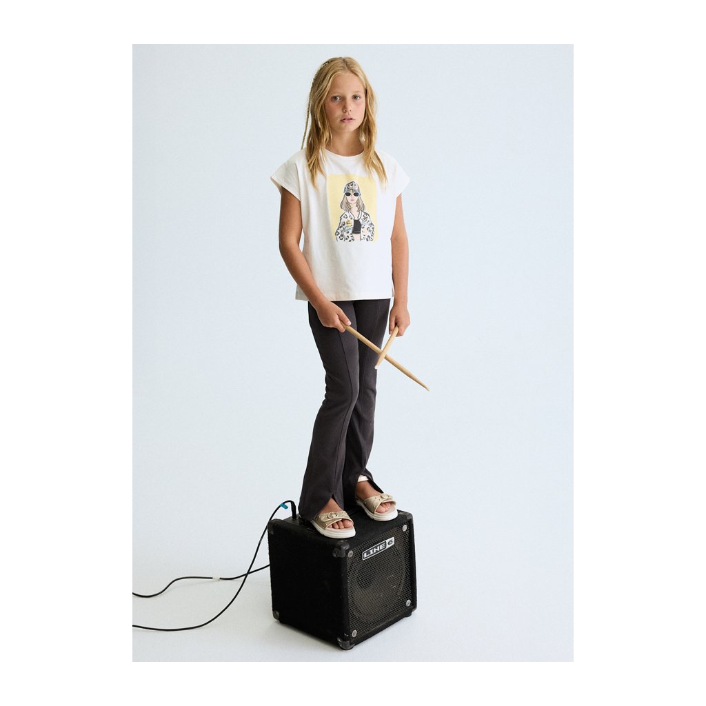 Modern lányos póló elülső nyomtatással kiváló választás kislányoknak. A finom hátsó nyakkivágás stílusos és kényelmes megjelenést kölcsönöz a pólónak. Az egyszerű szabás egész napos kényelmet biztosít.