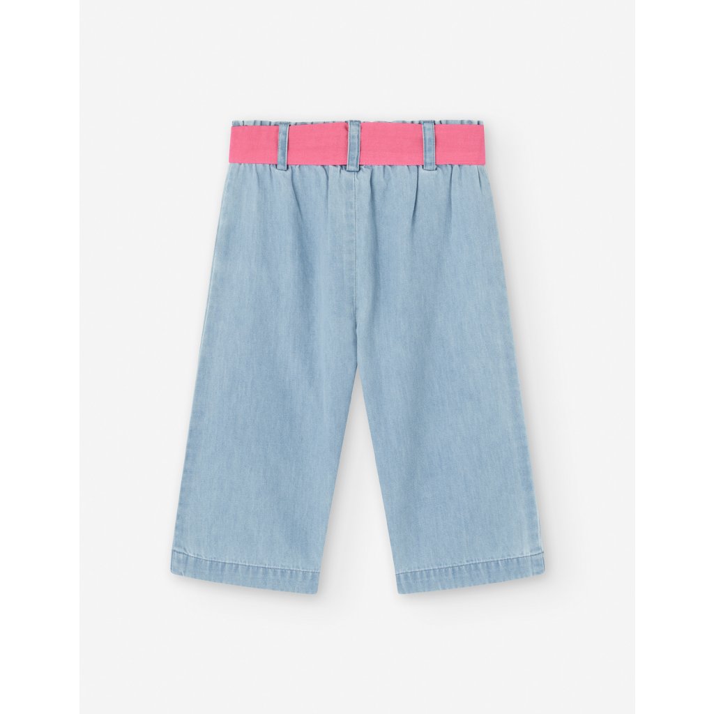 Stílusos lány farmernadrág 7/8 hosszúsággal, bővített szabással és finom anyagból készült rózsaszín övvel, amely kiemeli a derekat és elegáns megjelenést kölcsönöz az outfitednek. Könnyű farmeranyag kényelmes és tartós, ideális mindennapi viselethez és szabad mozgáshoz.