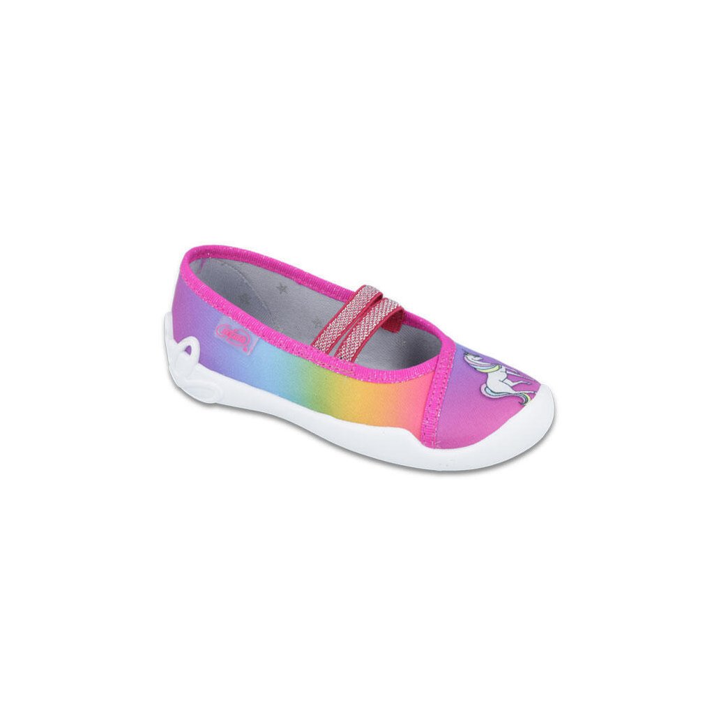 Kényelmes lányos balerina papucs Befado, ideális választás minden napra – akár otthon, óvodában vagy iskolában. Csak bepattintható, így nagyon gyorsan és egyszerűen felvehető. Az elasztikus gumiszalagnak köszönhetően a papucs jól tart a lábon, és alkalmazkodik a gyermek lábának formájához. Könnyű szerkezet és kellemes anyag biztosítja a kényelmet egész viselés közben. Remek váltócipő kislányoknak, akik a kényelemre és a szabad mozgásra vágynak.