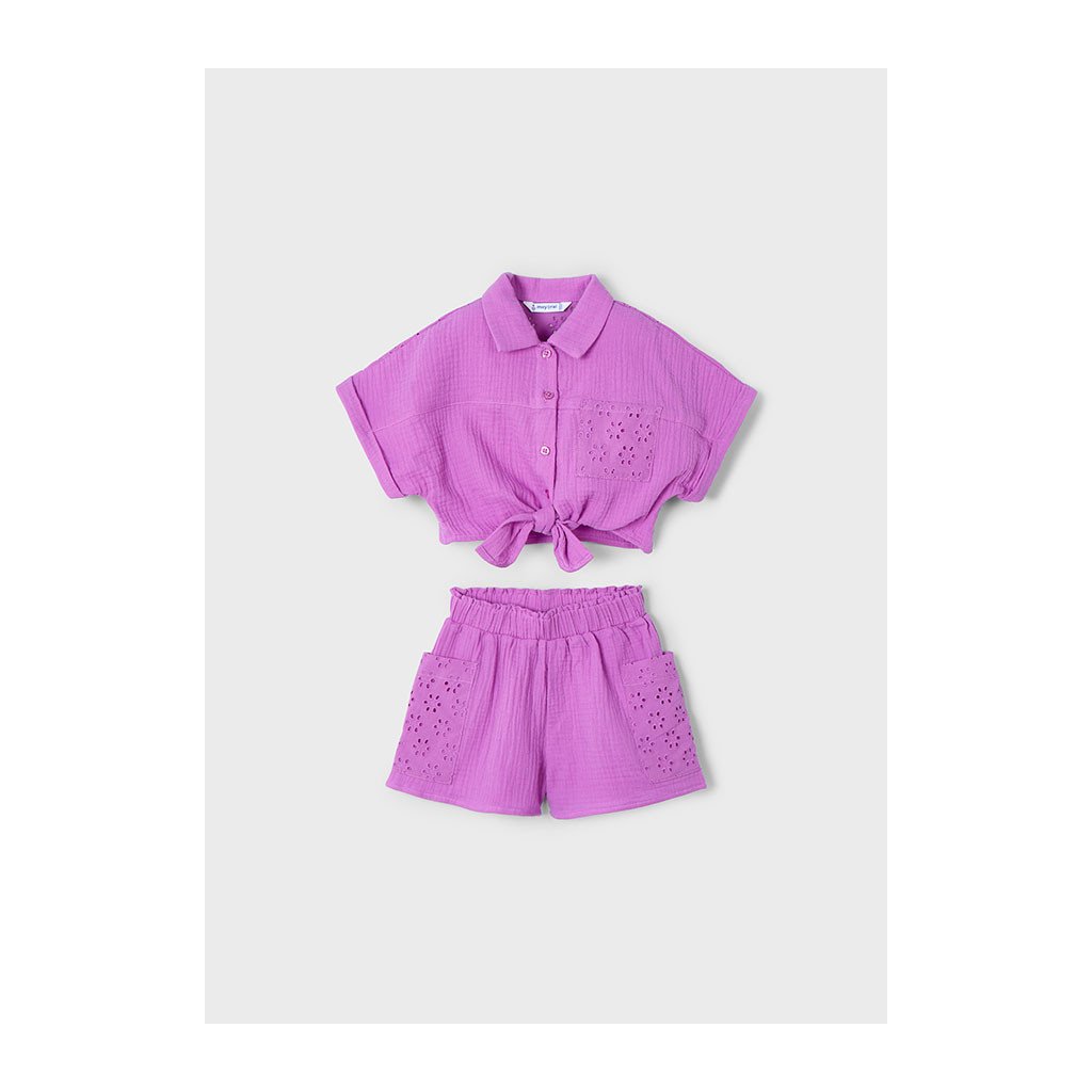 Gyönyörű 2-részes nyári lány szett MAYORAL finom Viola árnyalatban, amely friss, lányos és elegáns egyben. A szett tartalmaz könnyű nyári felsőt (póló vagy top) és kényelmes rövidnadrágokat.