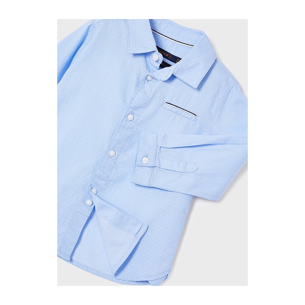 Stílusos kék fiú ing, a finom 100 % pamut anyagból, kényelmes és praktikus mindennapi viseletre, valamint különleges alkalmakra. A finom fehér pöttyök játékos és elegáns megjelenést kölcsönöznek az ingnek. A mellzseb imitációja praktikus részletet ad hozzá.