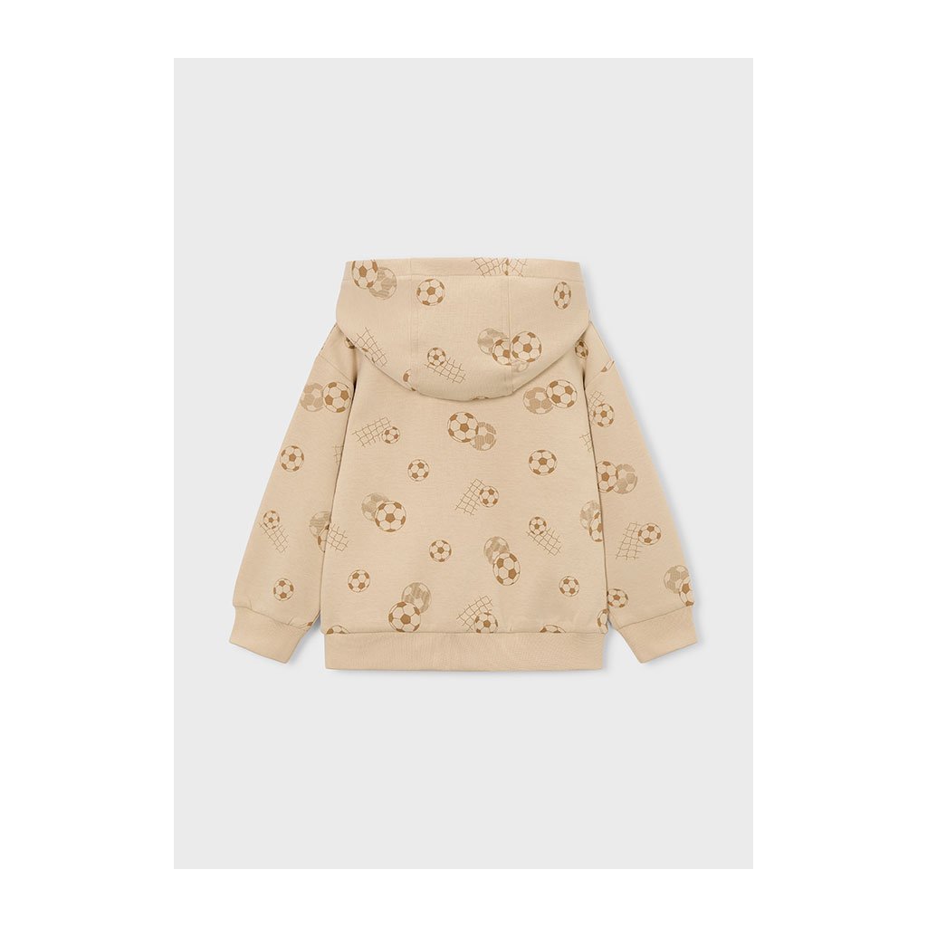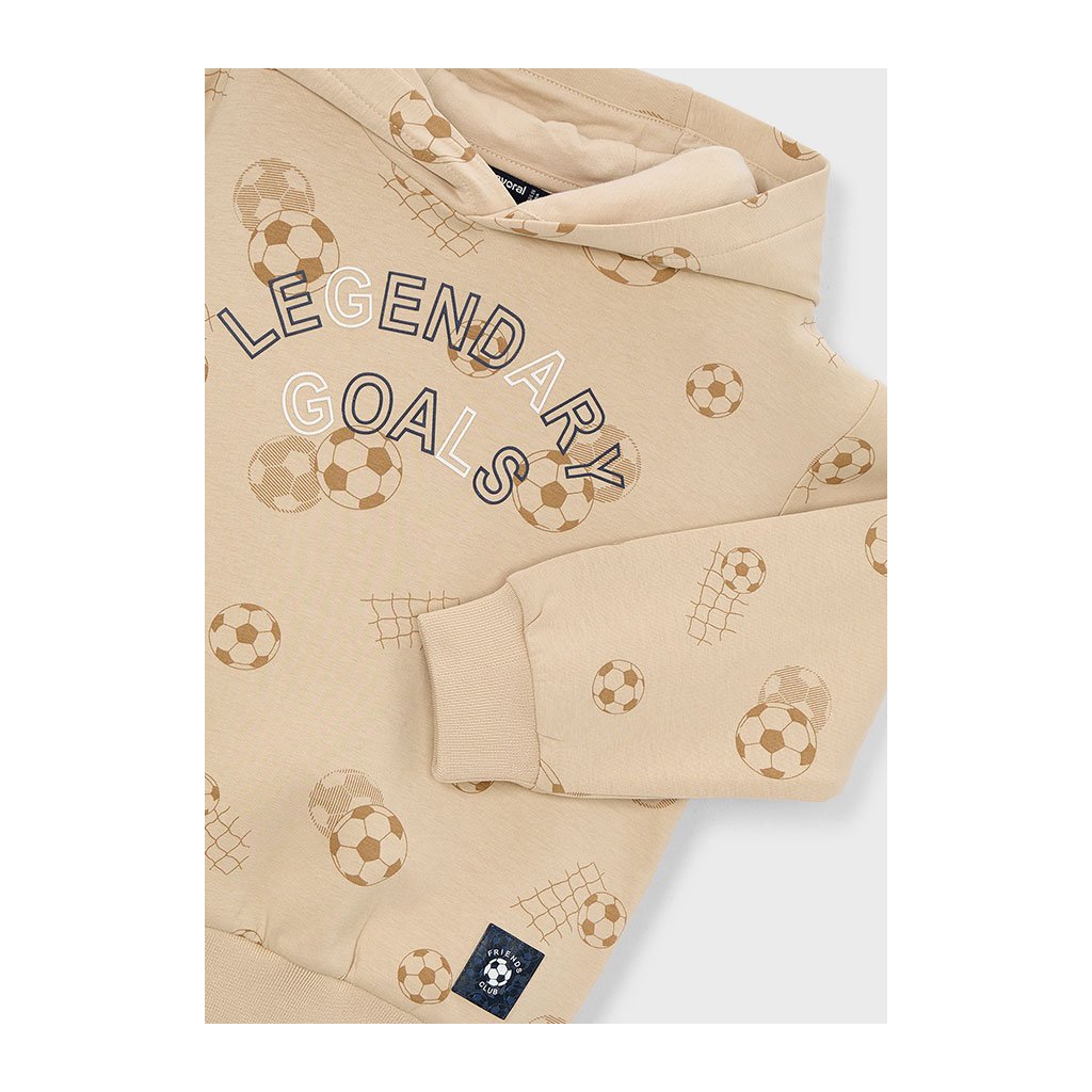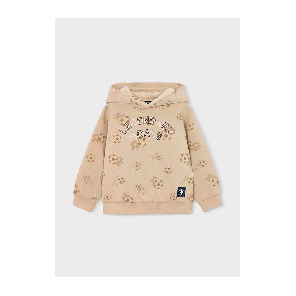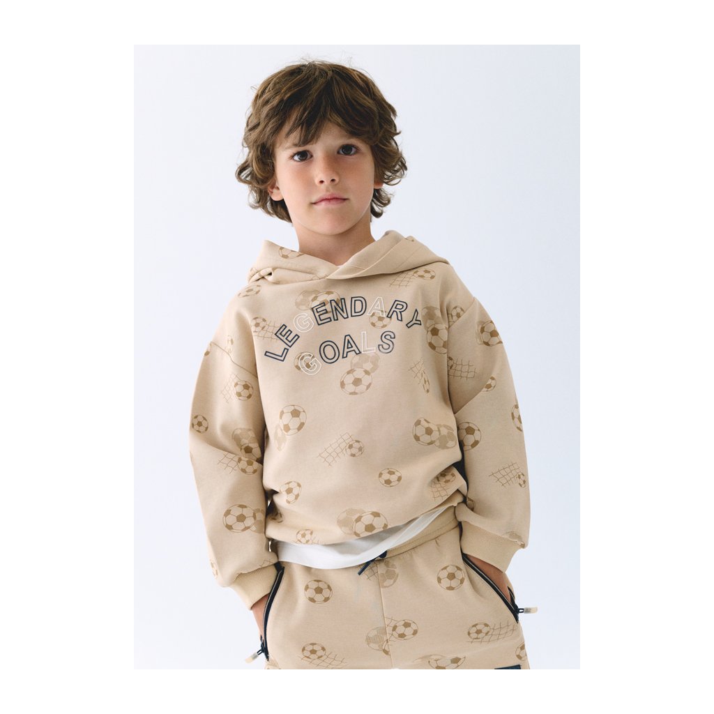 Beige színű kapucnis pulóver stílusos és kényelmes darab kicsiknek és nagyobb focirajongóknak egyaránt. Az elülső részt modern focilabda nyomtatás díszíti, amelyet hangsúlyos felirat egészít ki. Kellemes anyaga biztosítja a kényelmet egész napos viselés során.