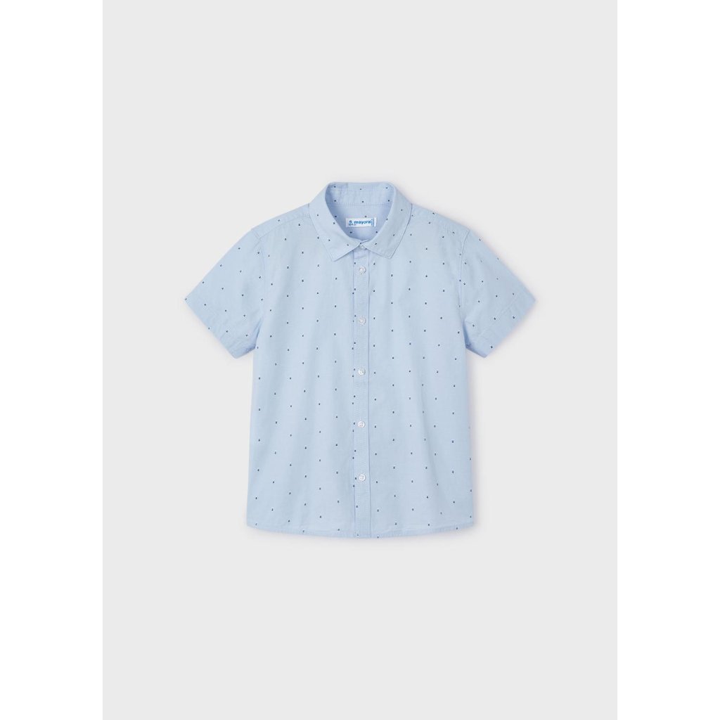 Stílusos kék fiú ing Mayoral teljes felületen apró pöttyös mintával, amely 100 % pamutból készült, így biztosítva a kényelmet és a szabad mozgást egész nap.