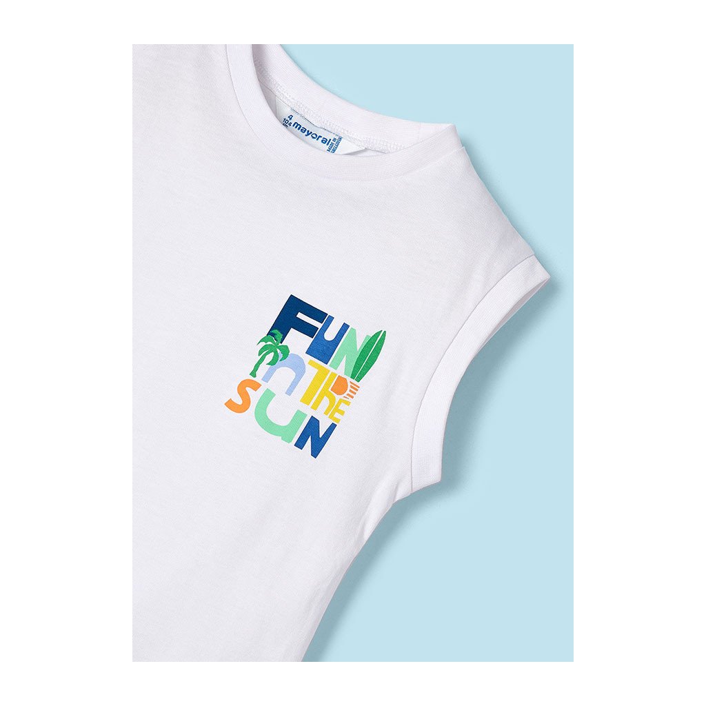 Könnyű és kényelmes fiú ujjatlan póló a Mayoral márkától, ideális a meleg nyári napokra. 100 % kiváló minőségű pamutból készült, amely puha, légáteresztő és kellemes a gyermek bőrének. A praktikus ujjatlan szabás maximális kényelmet és szabad mozgást biztosít játék és sport közben.