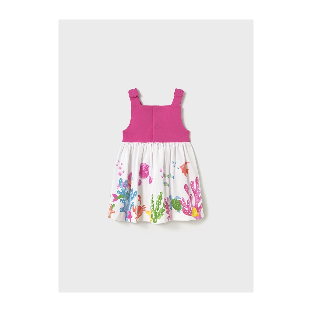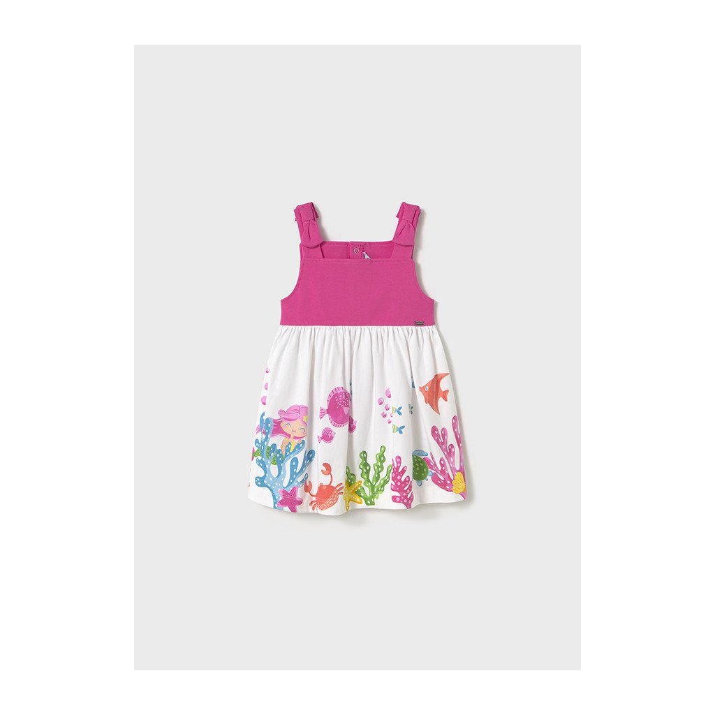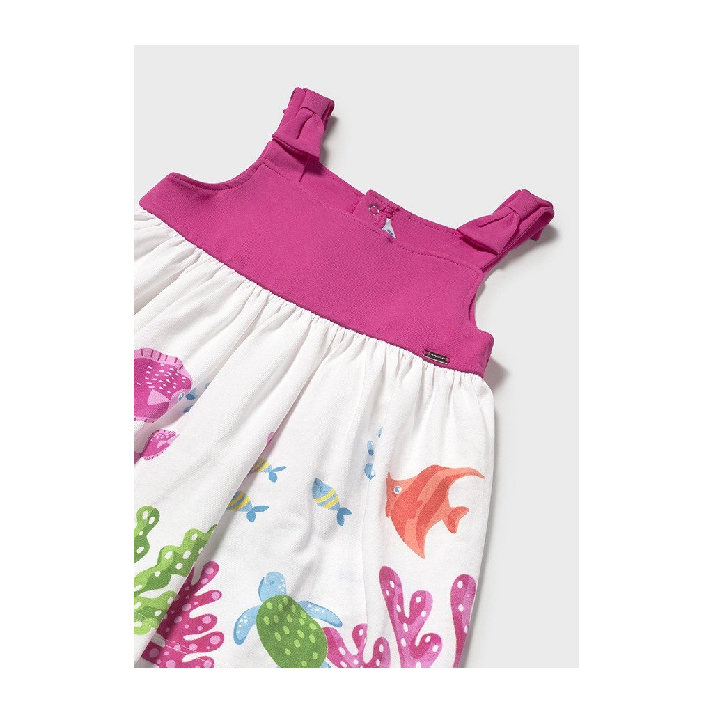 Pamut ruha a MAYORAL márkától, ideális forró nyári napokra. Az ujjatlan szabás és a tunika stílus szabad mozgást és kényelmet biztosít, míg a ciklámen szín és a színes részletek vidám és játékos megjelenést kölcsönöznek a ruhának.